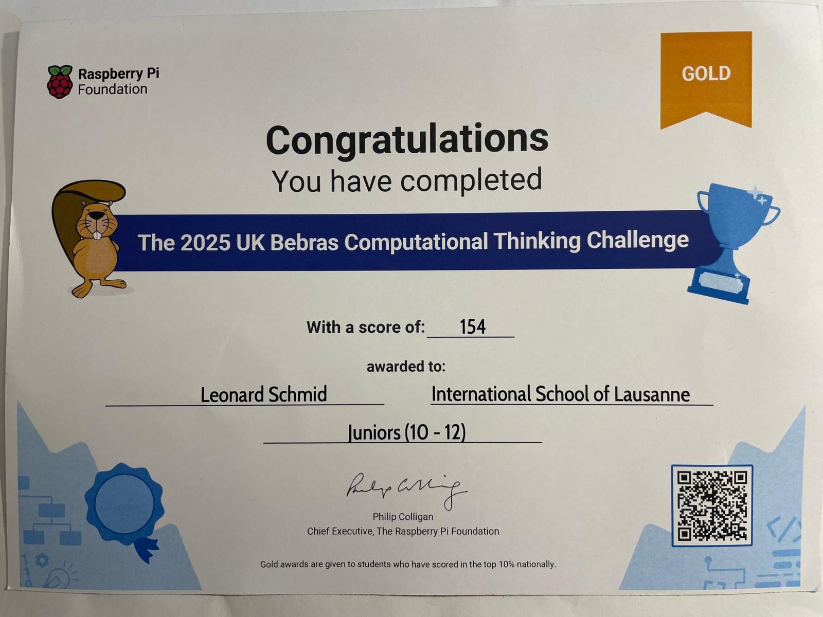- Gold certificate (students who have scored in the top 10% nationally), 2025 UK Bebras Computational Thinking Challenge (https://bebras.uk)
