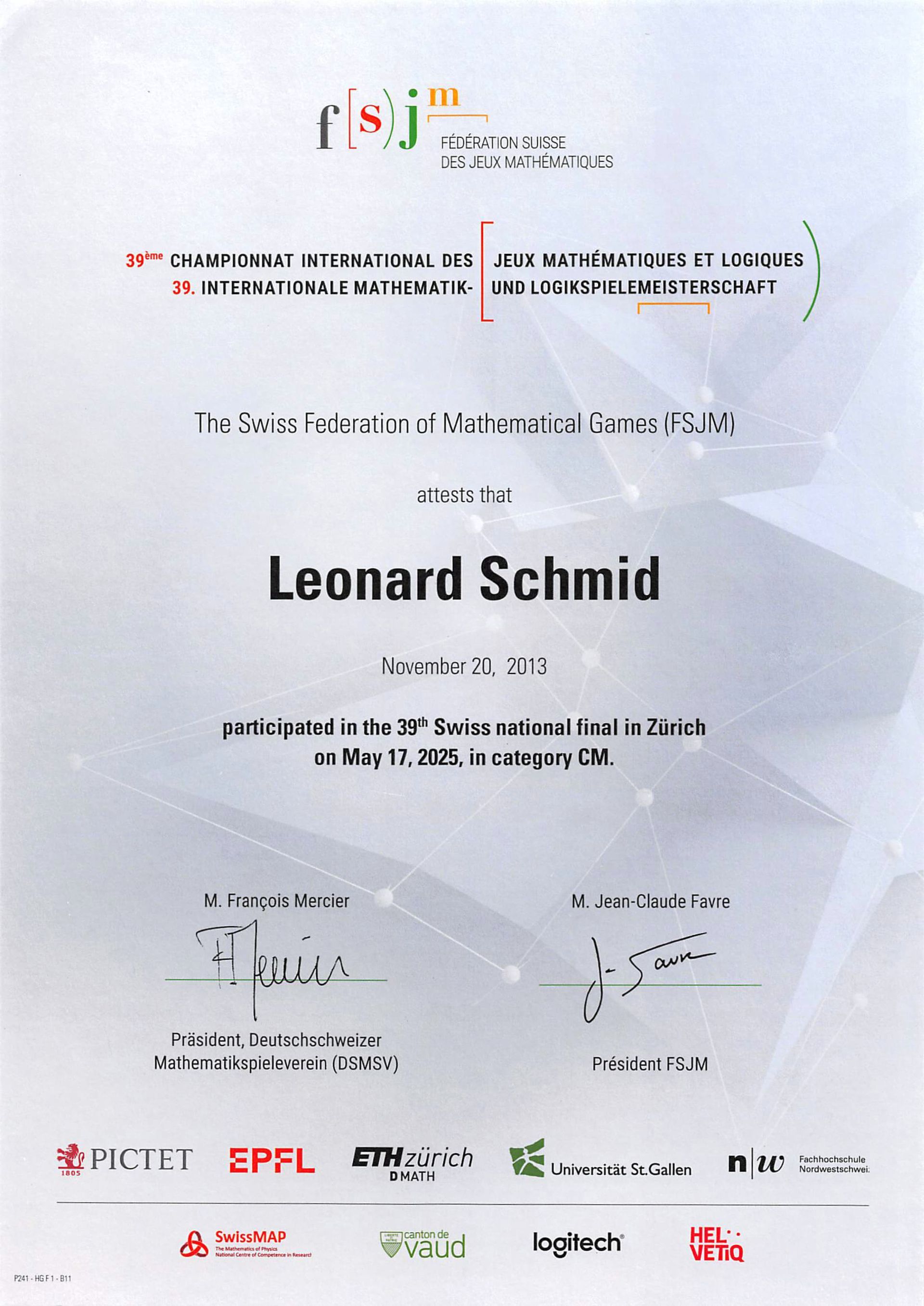 - Equivalent to Silver medal, FSJM** Championship of Mathematical and Logical Games, in Switzerland, May 2025 (For his age group Leonard ranked 38th in entire Switzerland: https://online.fsjm.ch/en/ranking/39/30/zurich/0/cm)